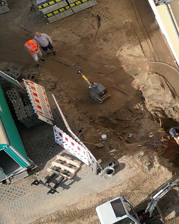 Slow-Motion eines Stampfers bei der Verdichtung von Schotter.